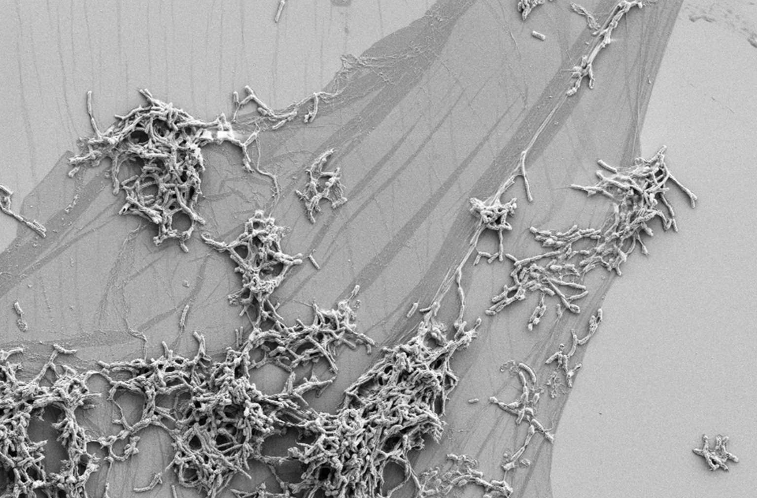 Multiple salmonella bacteria assembling to form a biofilm structure.