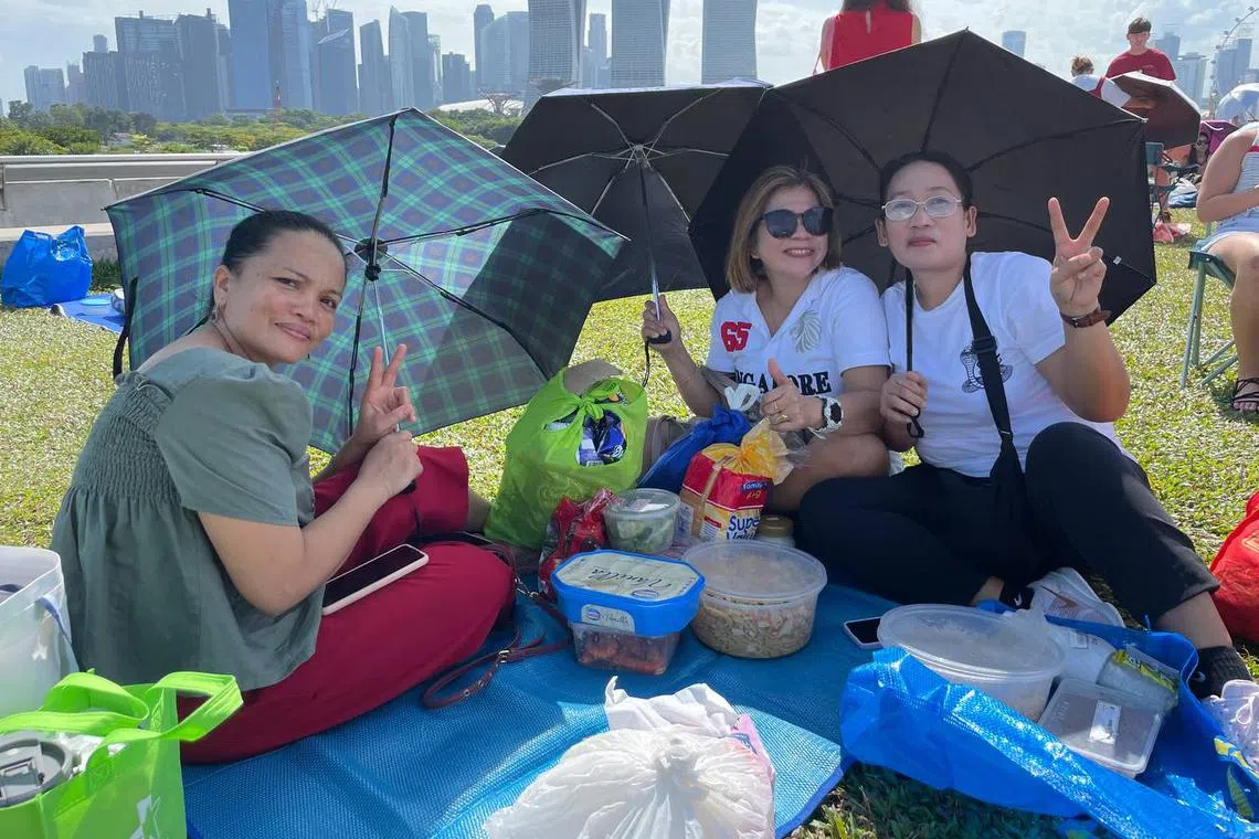 Domestic helper Alzel Garcia, 40, sat with friends she had met while picking up the children she cares for at their primary school. The Filipina has been working in Singapore for nine years.