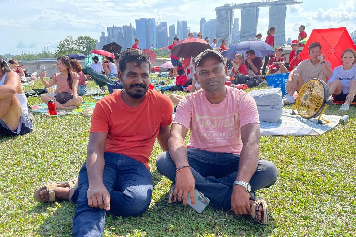 Construction workers Sai Bale (left) and Ramesh Kukunoori found a priceless spot at the front of the festivities at the Marina Barrage Green Roof.