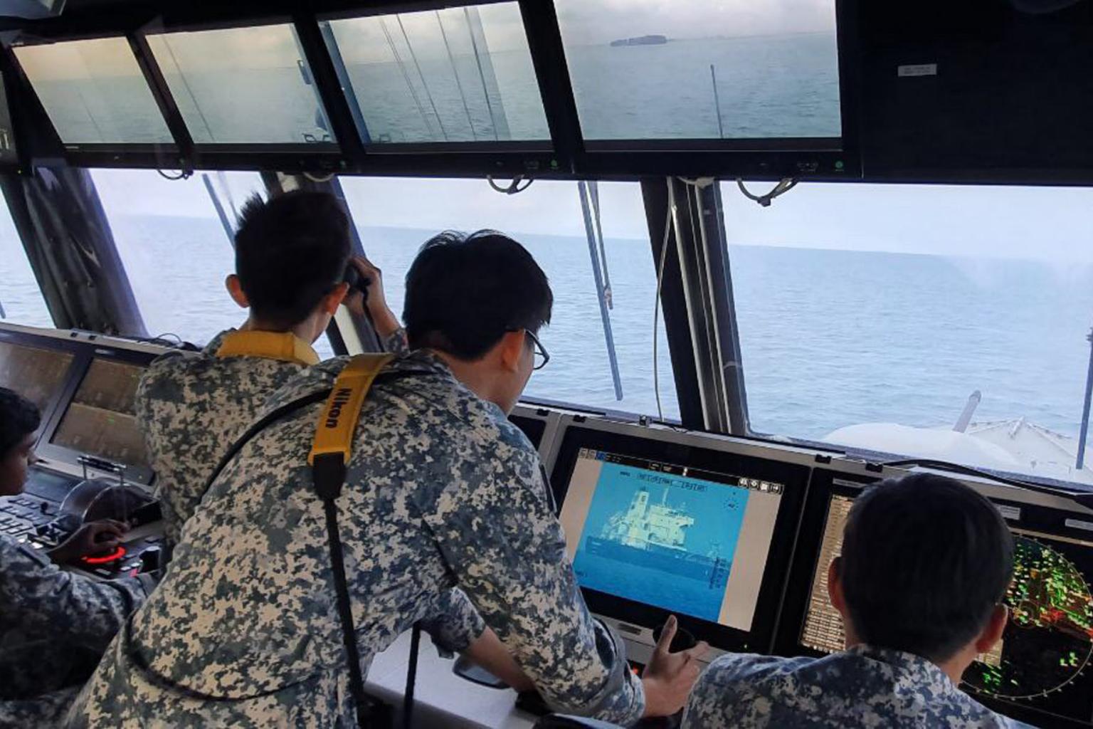 Republic of Singapore Navy personnel on board RSS Independence on March 16 monitoring a Liberian-flagged shipping vessel, Sam Jaguar, which reported that pirates had boarded the ship.