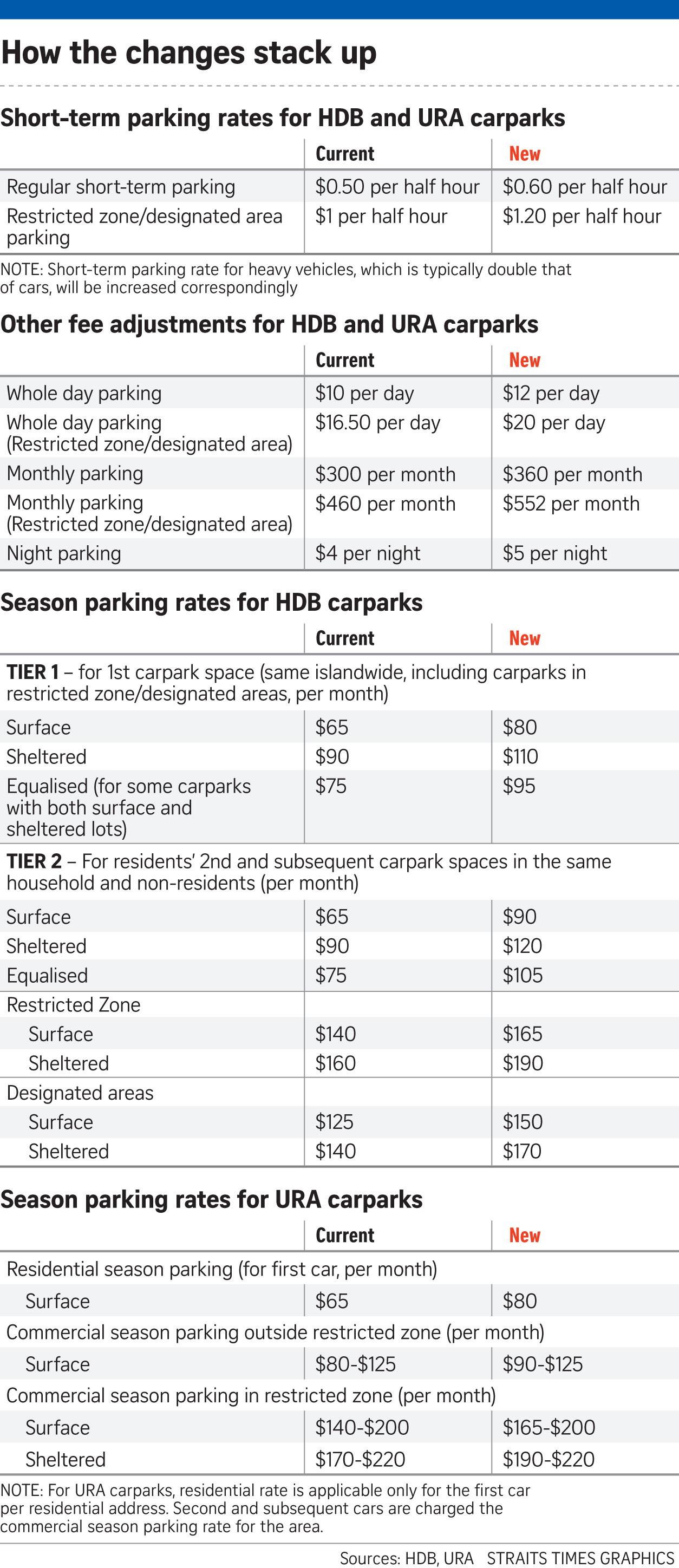 This will be the first time public parking rates are being raised since 2002, when rates were increased about 10 per cent.The Housing Board and the Urban Redevelopment Authority manage 607,000 and 24,000 parking spaces respectively.