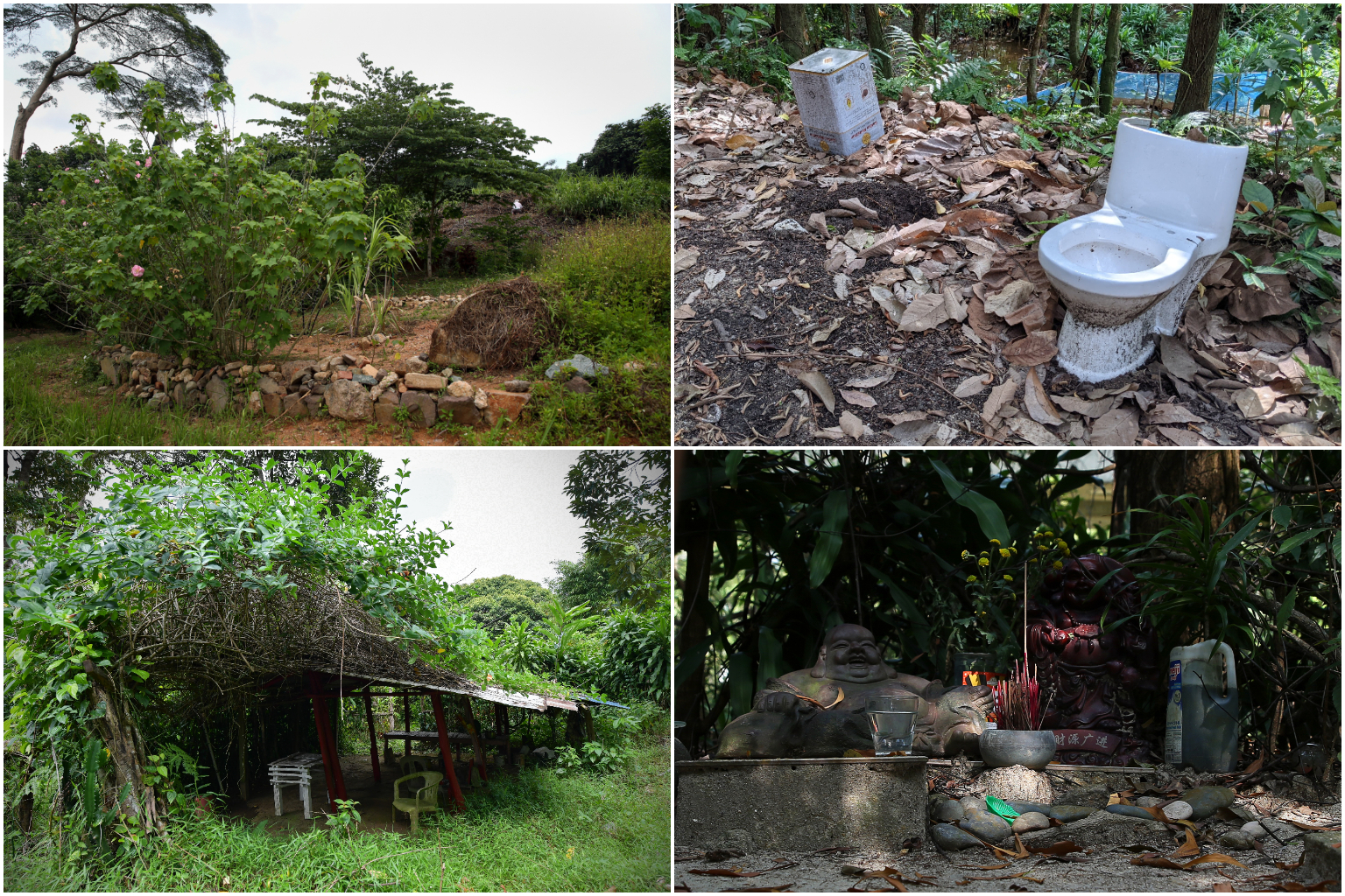 (Clockwise from top left) A secret garden in Bukit Gombak and another in Bukit Batok, a shrine in Tampines Eco Green park and a mini lodge in Mandai.