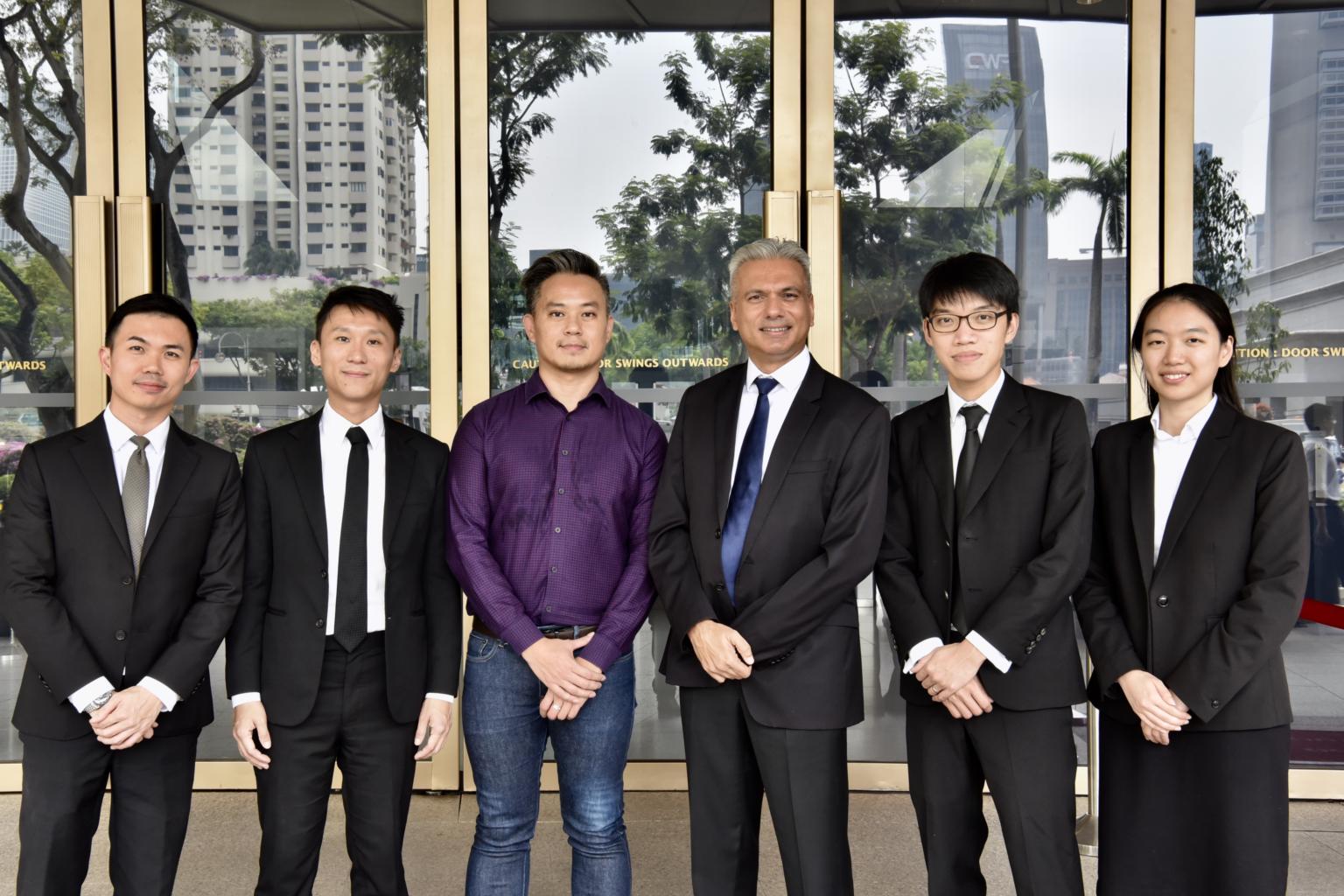 Mr Bryan Choong Chee Hong (in purple) with his lawyers, (from left) Mr Jordan Tan, Mr Remy Choo Zheng Xi, and Senior Counsel Harpreet Singh Nehal, who are assisted by Mr Wong Thai Yong and Ms Priscilla Chia Wen Qi.