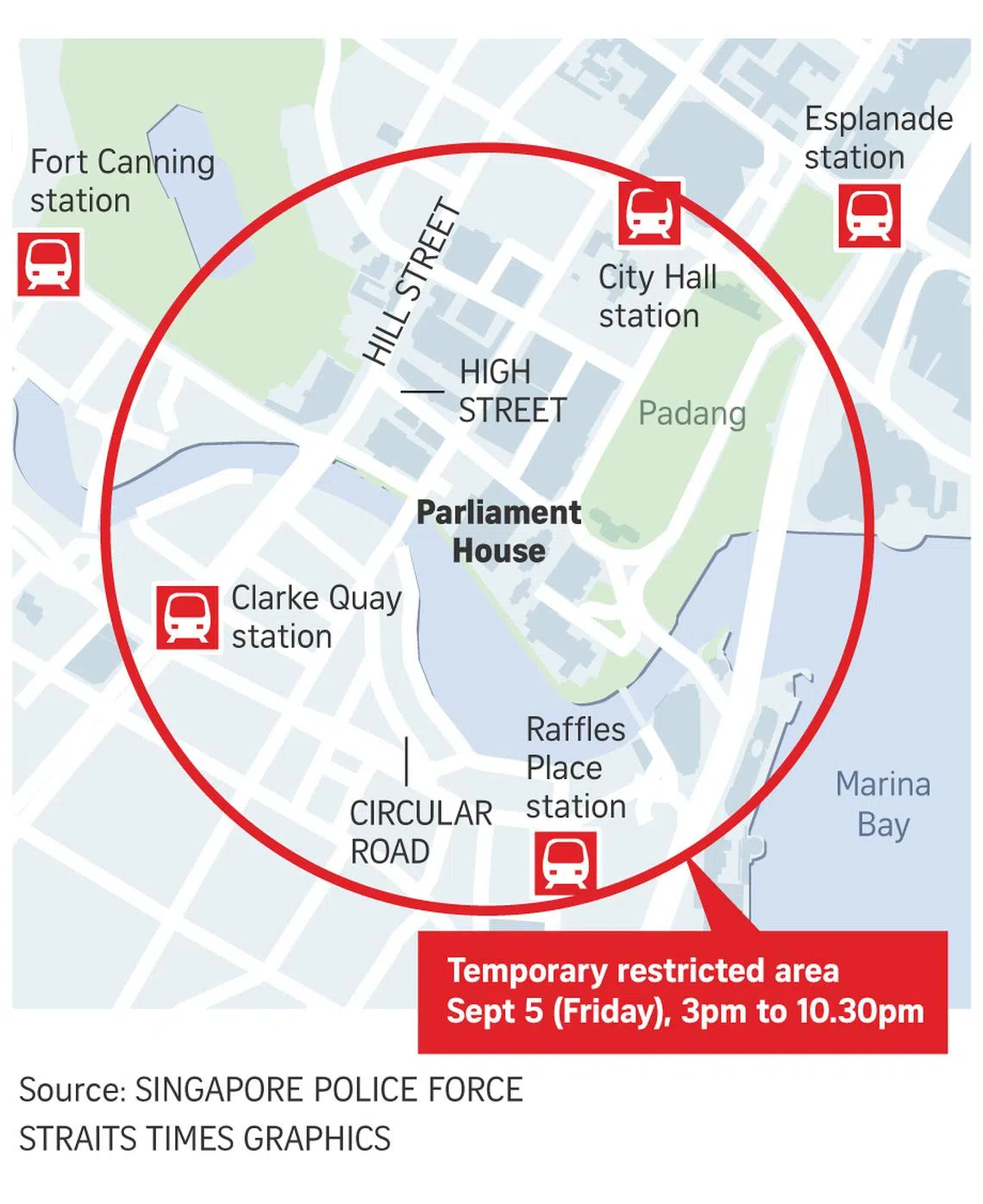 Separately, the Civil Aviation Authority of Singapore will establish a Temporary Restricted Area (TRA) over Parliament House on Sept 5 from 3pm to 10.30pm.