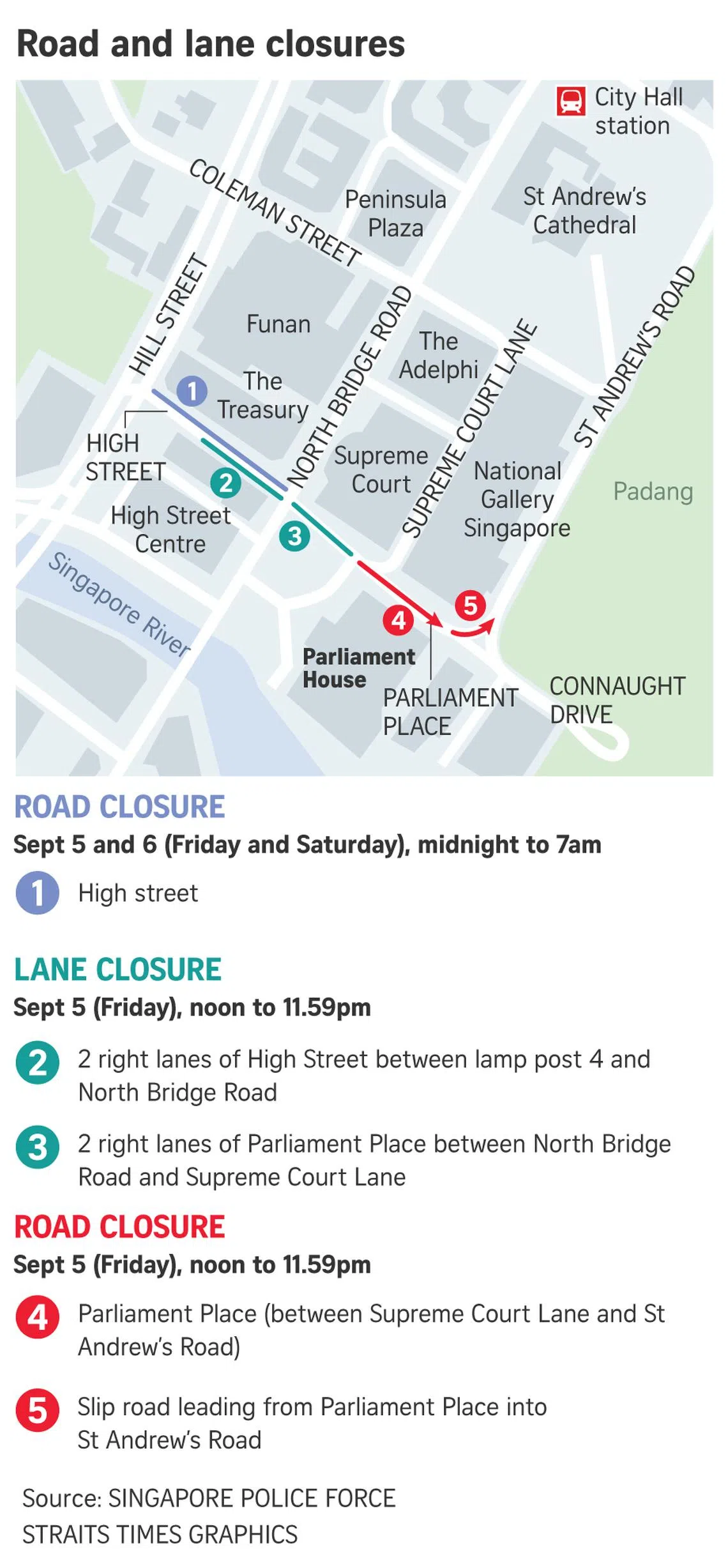 On Sept 5, Parliament Place between Supreme Court Lane and St Andrew’s Road, the slip road from Parliament Place into St Andrew’s Road, two right lanes of High Street between lamp post 4 and North Bridge Road, and two right lanes of Parliament Place between North Bridge Road and Supreme Court Lane will be closed from 12pm to 11.59pm.