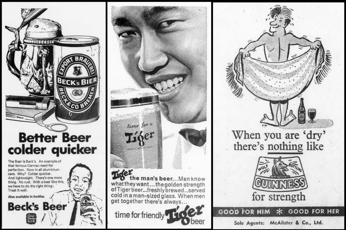 Beer ads from Beck's, Tiger and Guinness stout ran on April 3, 1971; July 7, 1965; and Jan 29, 1965, respectively.