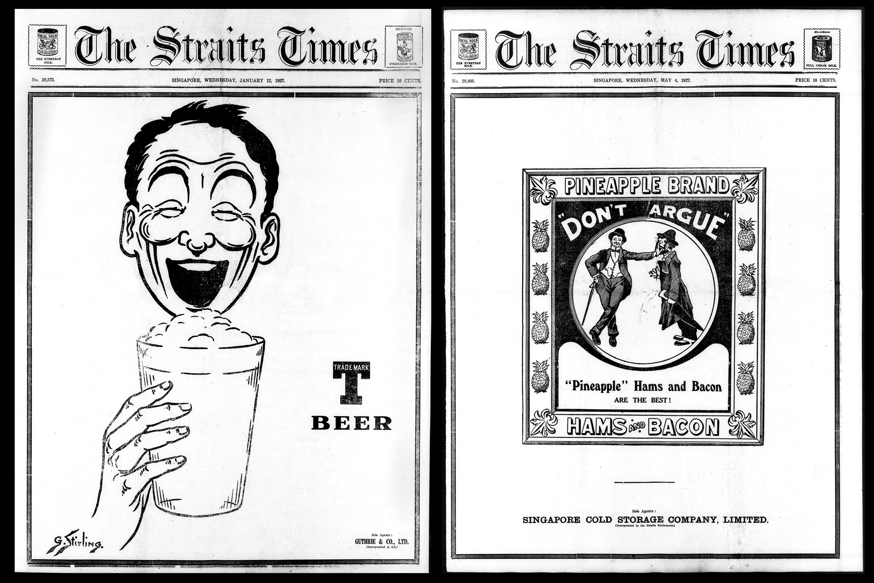 It was not uncommon for the front pages of 1927 to feature full-page ads like those for T beer on Jan 12 and Pineapple Brand ham and bacon on May 4.