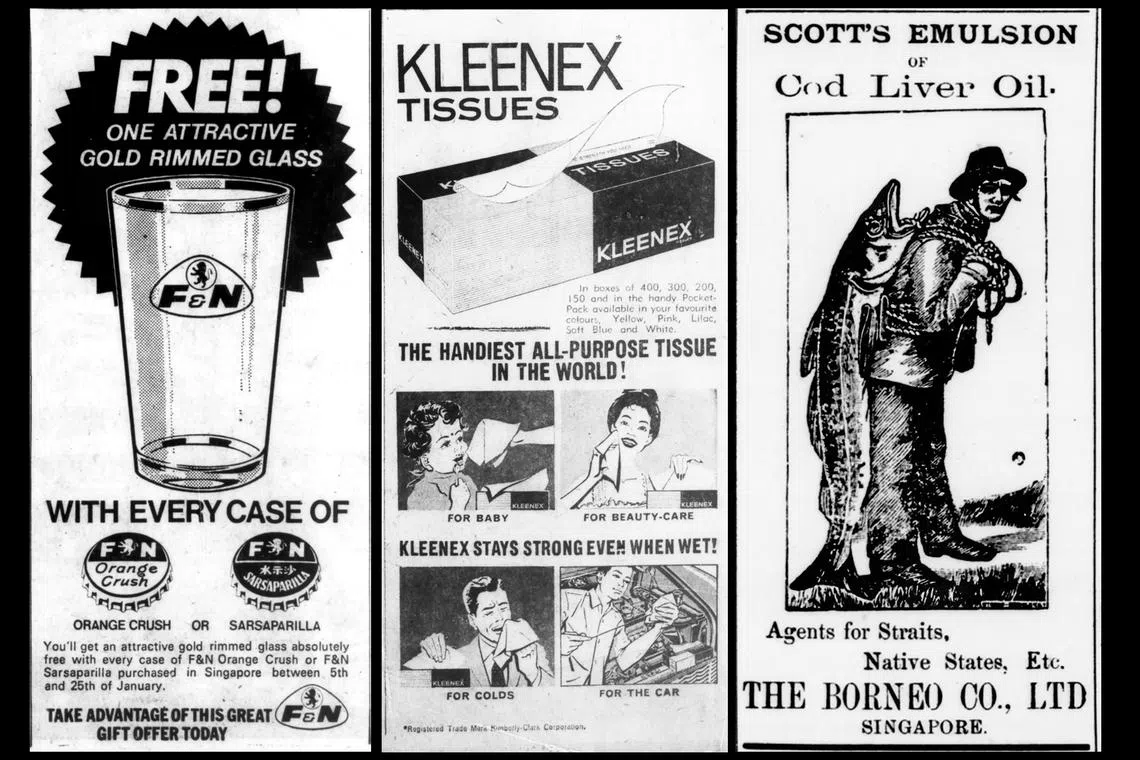 Local companies representing famous foreign brands in Singapore took out regular ads such as those for (from left) F&N soft drinks, Kimberly-Clark's Kleenex tissues and The Borneo Company's Scott's emulsion of cod liver oil.
