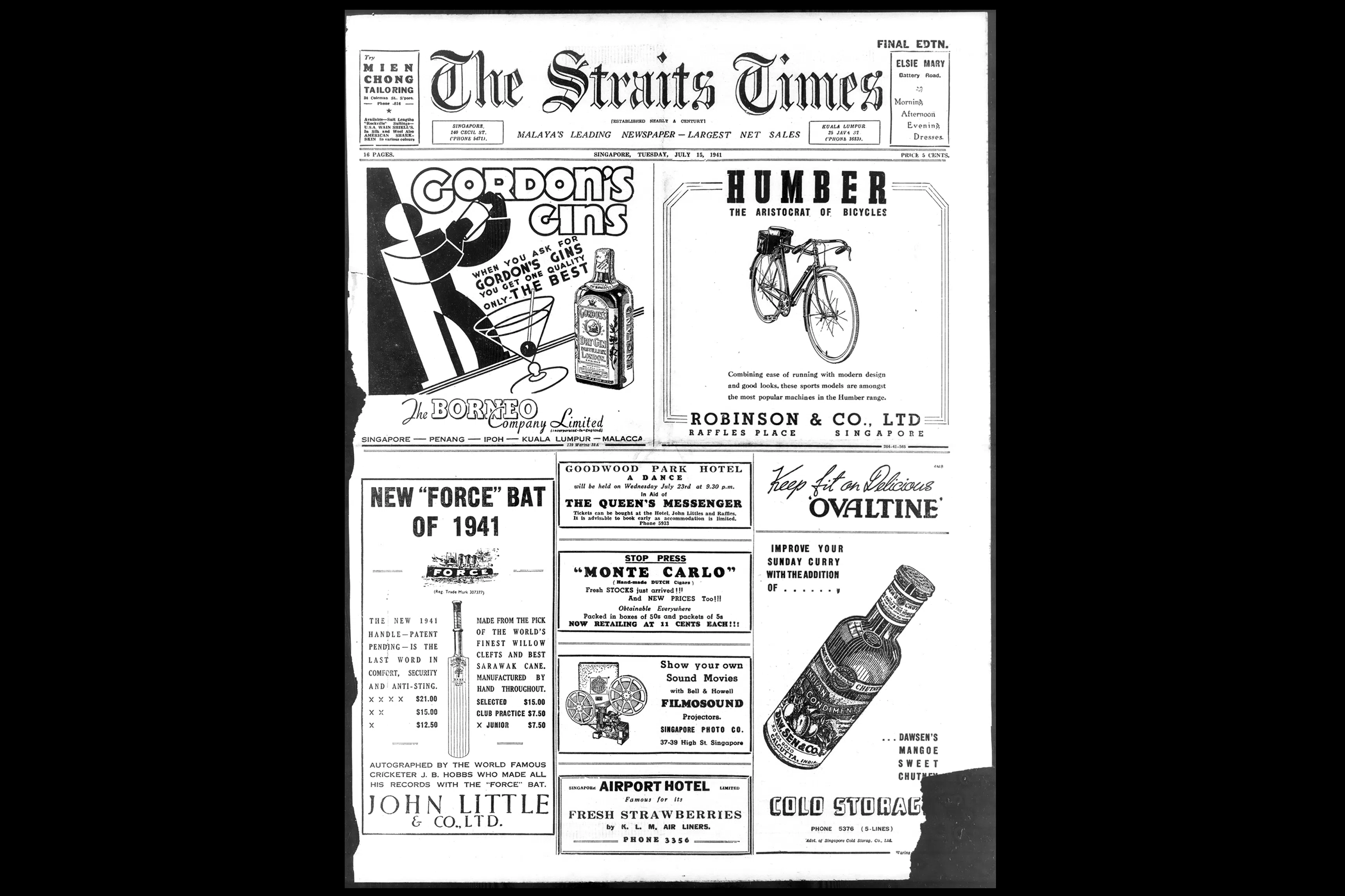 Take July 15, 1941. The entire front page featured 11 ads. Among them, Mien Chong Tailoring in Coleman Street offered American sharkskin fabric in various colours; Robinson & Co in Raffles Place touted the Humber, “the aristocrat of bicycles”; and a merchant announced the arrival of more stocks of “Monte Carlo” handmade Dutch cigars “obtainable everywhere” at 11 cents each.