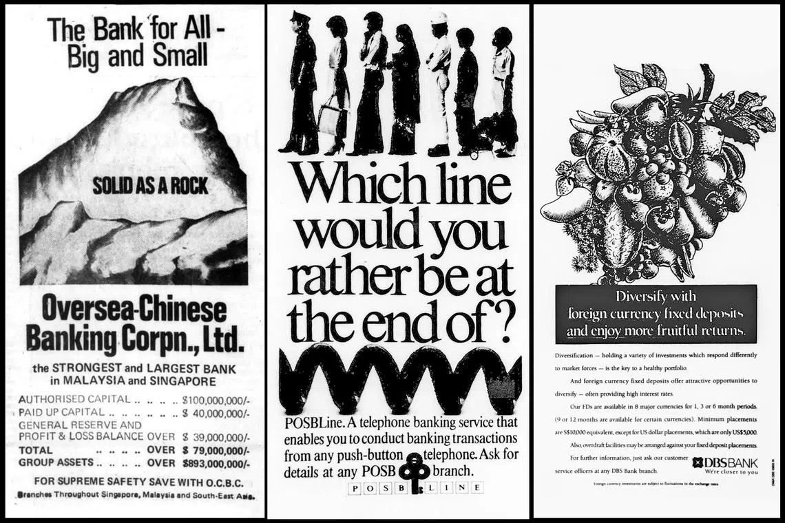 Local bank ads by (from left) OCBC in Jan 6, 1971; POSB in Jan 26, 1987; and DBS in May 5, 1991.