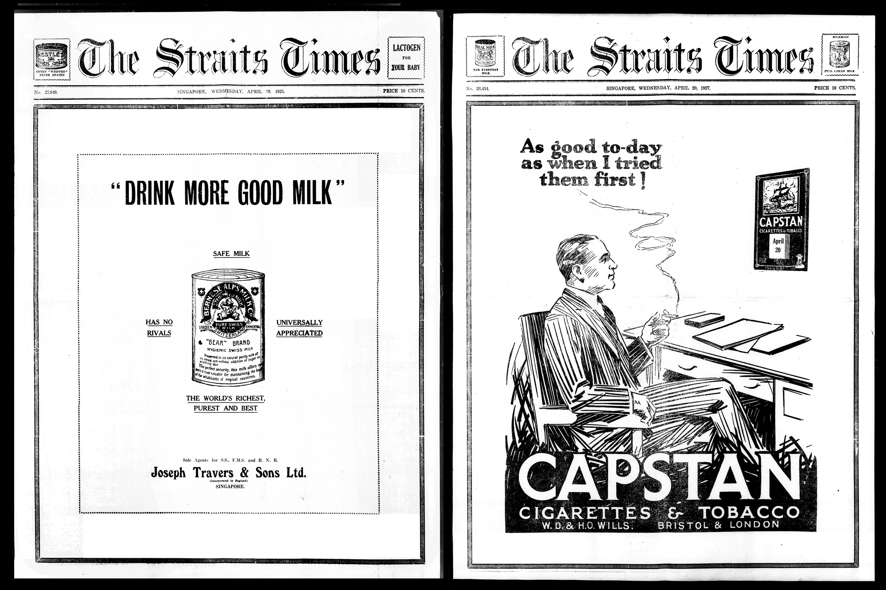 An ad for Bear brand hygienic Swiss milk appeared on April 29, 1925, while British brand Capstan advertised its cigarettes and tobacco products on April 20, 1927.