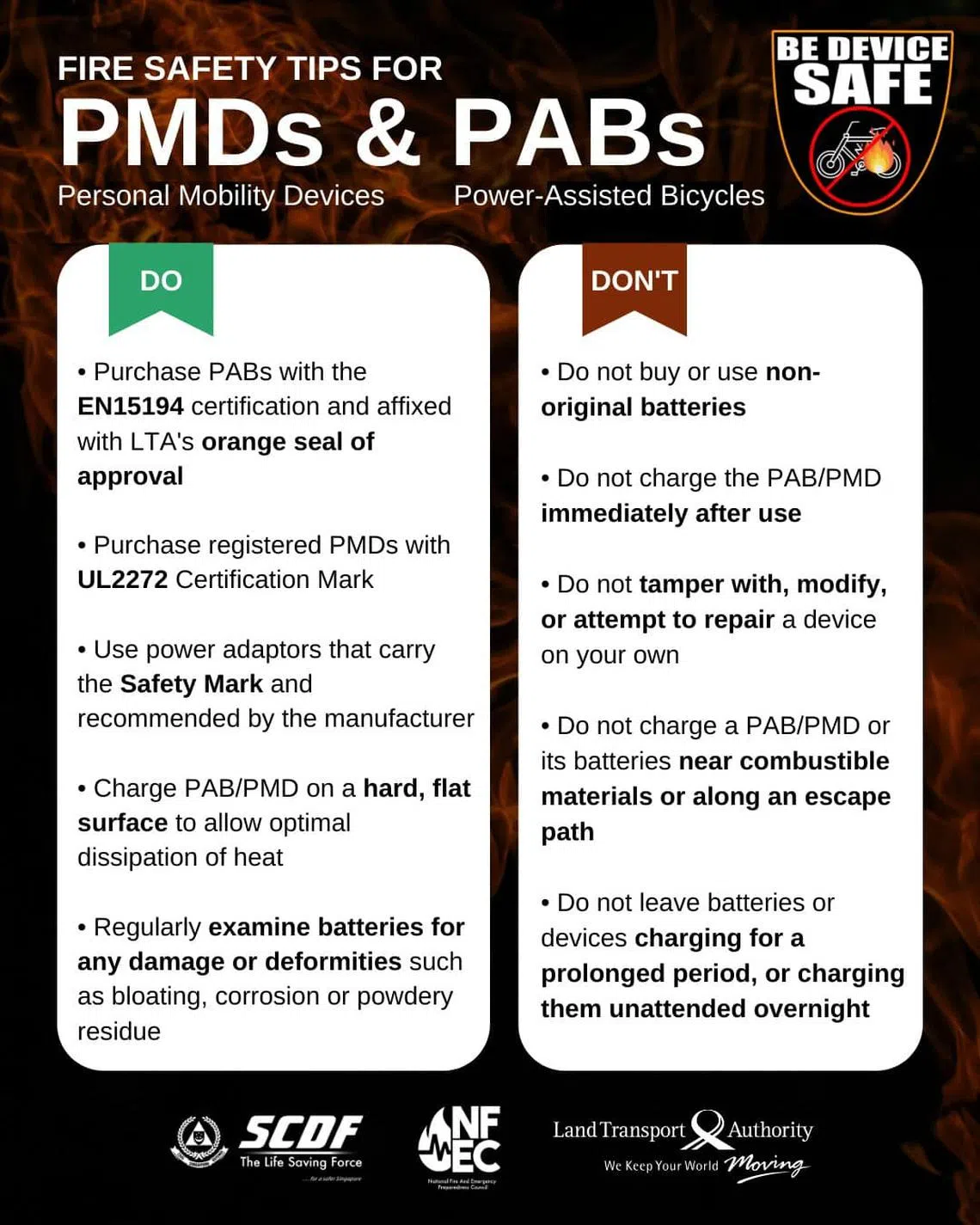 The Land Transport Authority and SCDF also have issued dos and don’ts to prevent fires involving PMDs and power-assisted bicycles.