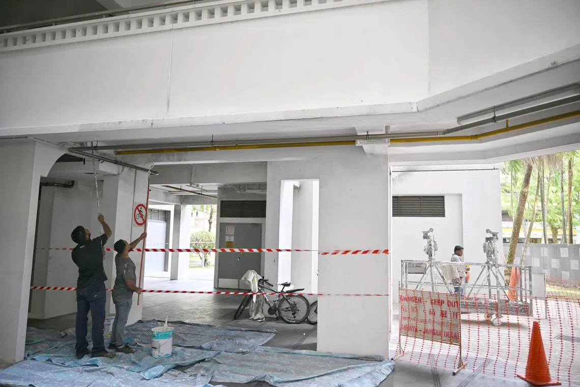 Workers painting the charred walls and ceiling at the void deck of Block 482 Admiralty Link on Aug 19, following an Aug 15 fire.