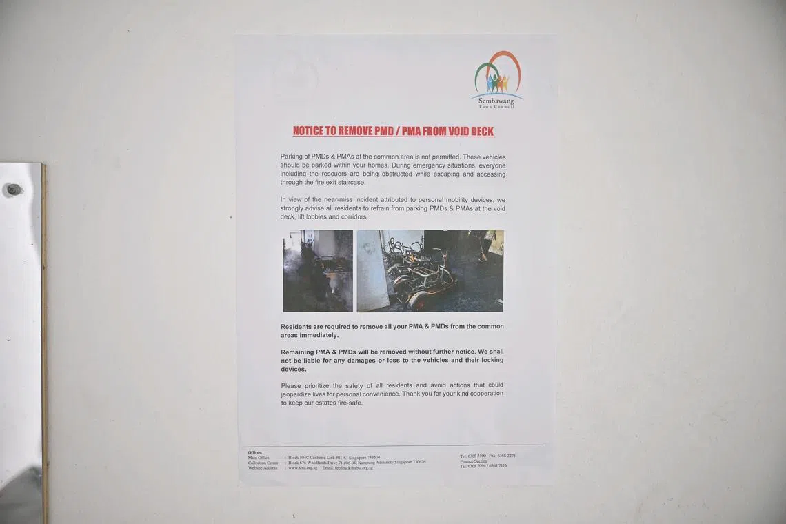 The town council notice also highlighted the dangers posed by PMDs and PMAs when left in high human-traffic zones like void decks, lift lobbies and corridors.