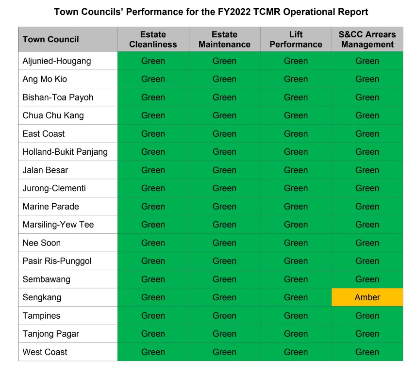 Chua Chu Kang Town Council and Jurong-Clementi Town Council, which both received amber ratings in the FY2021 report for S&CC arrears management, improved and were rated green in the latest report.
