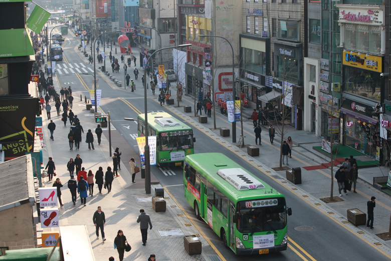 Seoul's Yonsei-ro, which was transformed from a congested road into a pleasant transit mall for pedestrians and public transport.