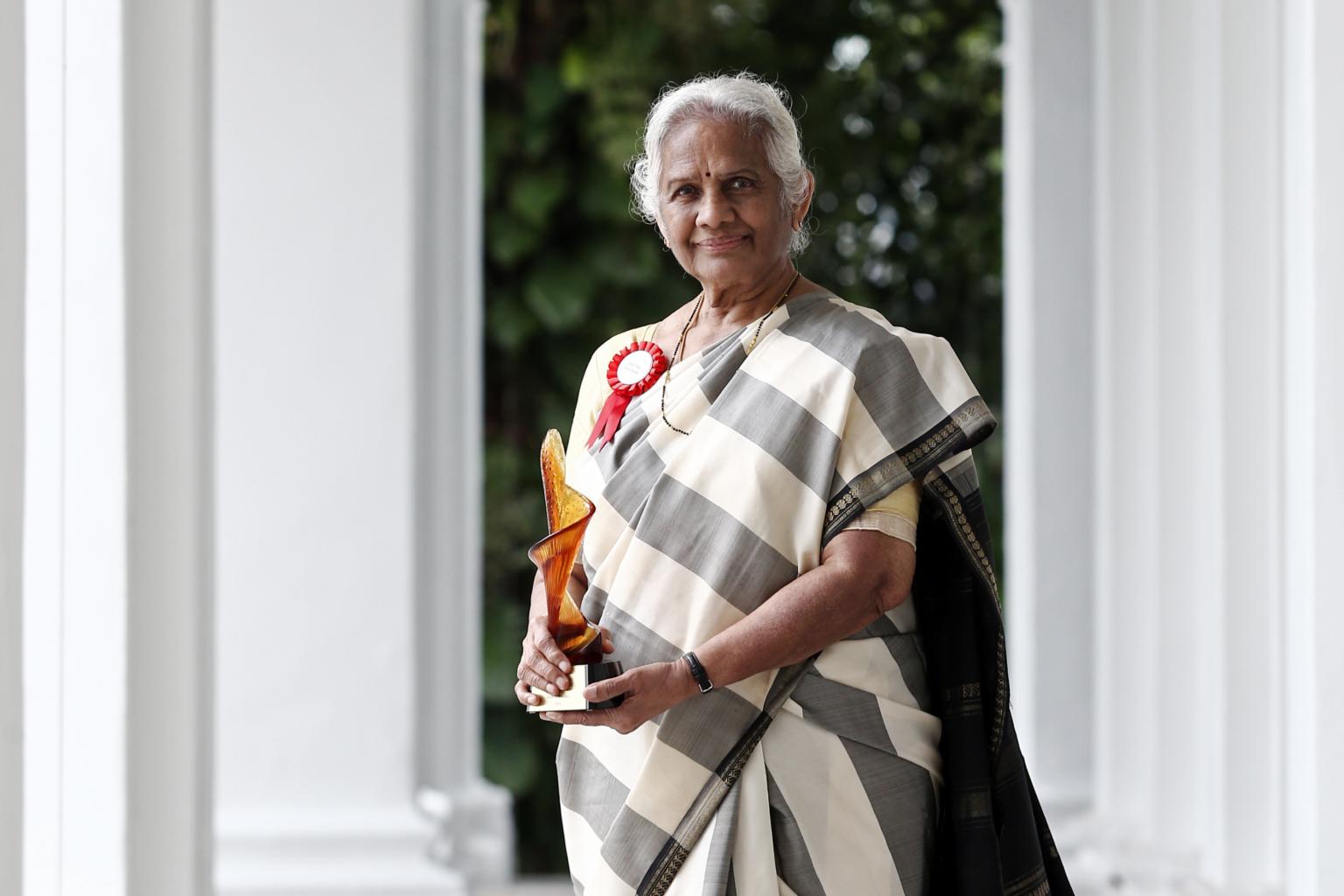 Mrs Santha Bhaskar received the Hall of Fame trophy from President Halimah Yacob at the Istana on March 8.