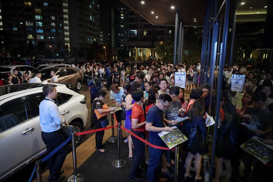 Long queues outside the Riverfront Residences showflat on Jul 5, 2018, the night before new cooling measures kicked in.