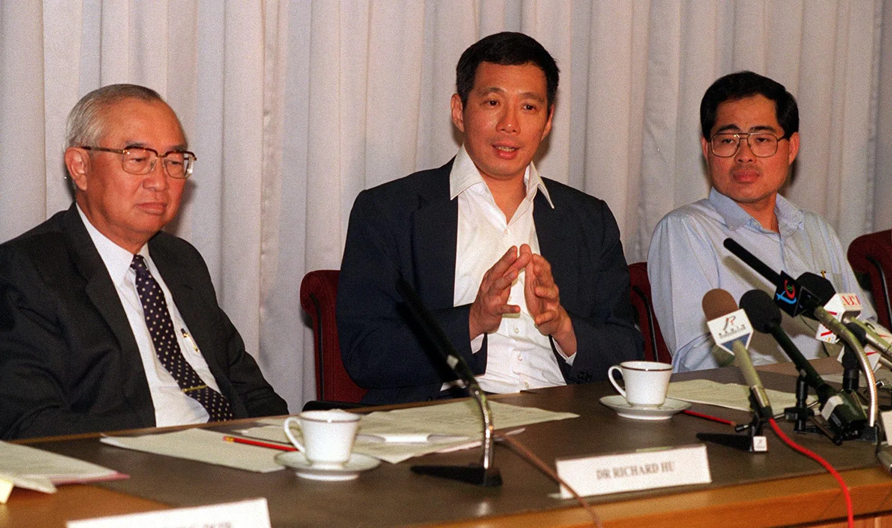 (From left) Then finance minister Richard Hu, deputy prime minister Lee Hsien Loong and national development minister Lim Hng Kiang at the May 15, 1996, press conference on measures to curb property speculation.