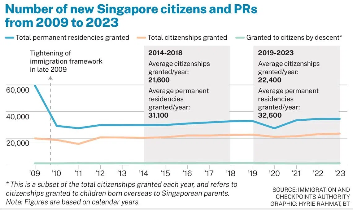 In the same year, the government tightened Singapore’s immigration framework, cutting inflows. The number of permanent residencies halved in the year after, to just under 30,000 in 2010. (The PR tally rose slightly to average 31,100 a year between 2014 and 2018, and to 32,600 a year between 2019 and 2023.)