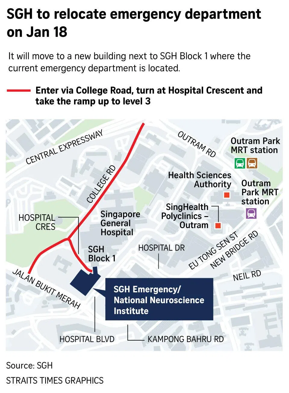 Those seeking emergency care from 7am on Jan 18 should go to level 3 of the new SGH Emergency/National Neuroscience Institute building at 1 Hospital Boulevard.