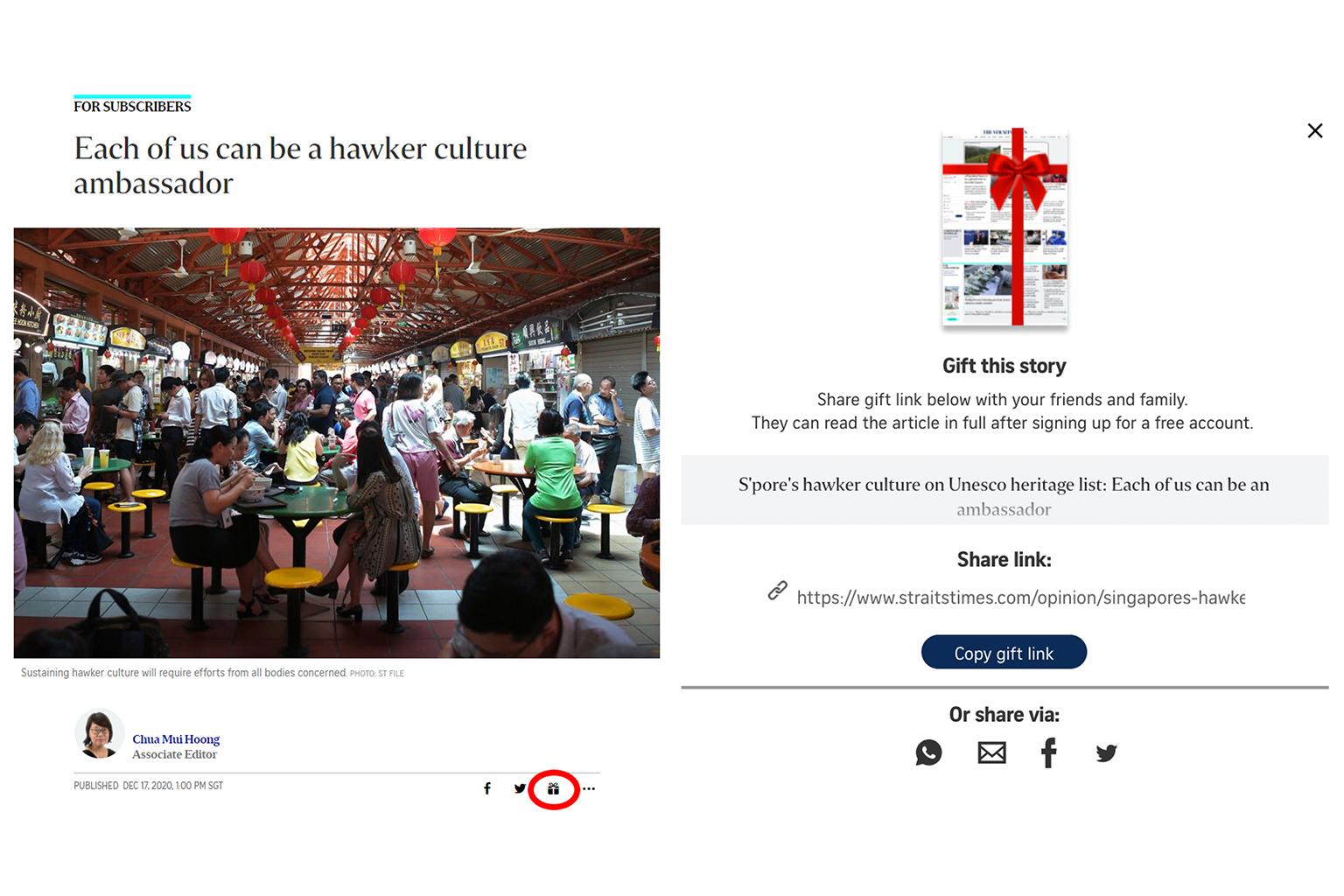 Those who receive the "gift links" can read subscriber-only articles shared with them, even if they have not signed up for an ST subscription.
