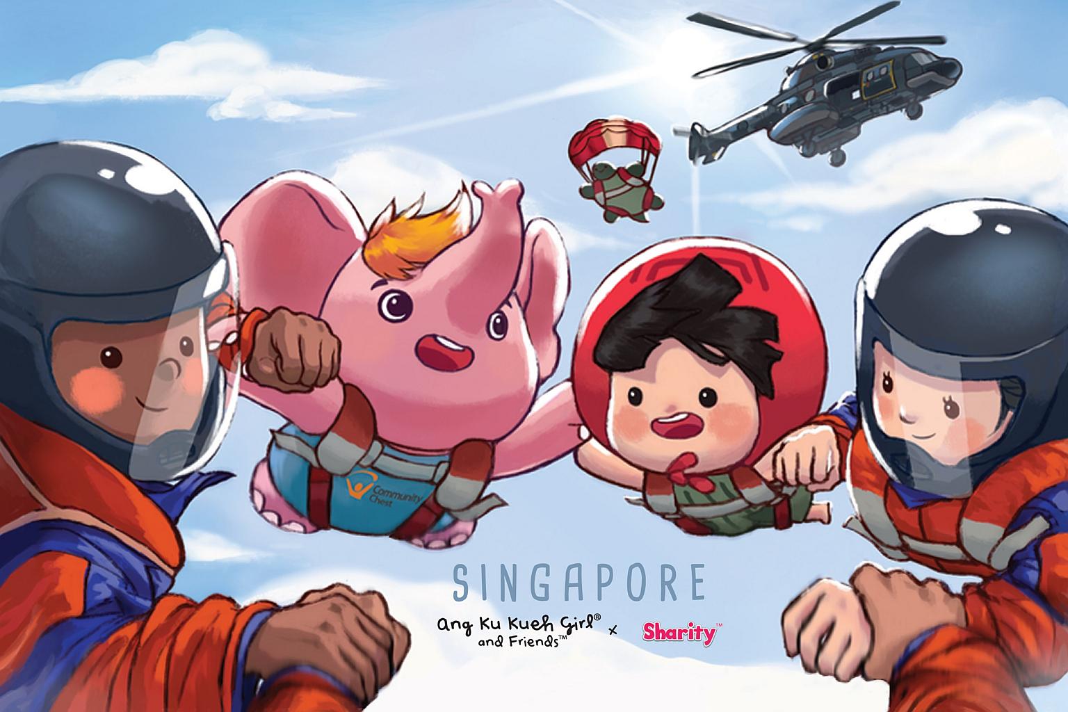 Sharity, the mascot of Community Chest, and Ang Ku Kueh Girl are depicted in the cards alongside NDP crowd favourites, such as the SAF's Red Lions and the RSAF's Black Knights.