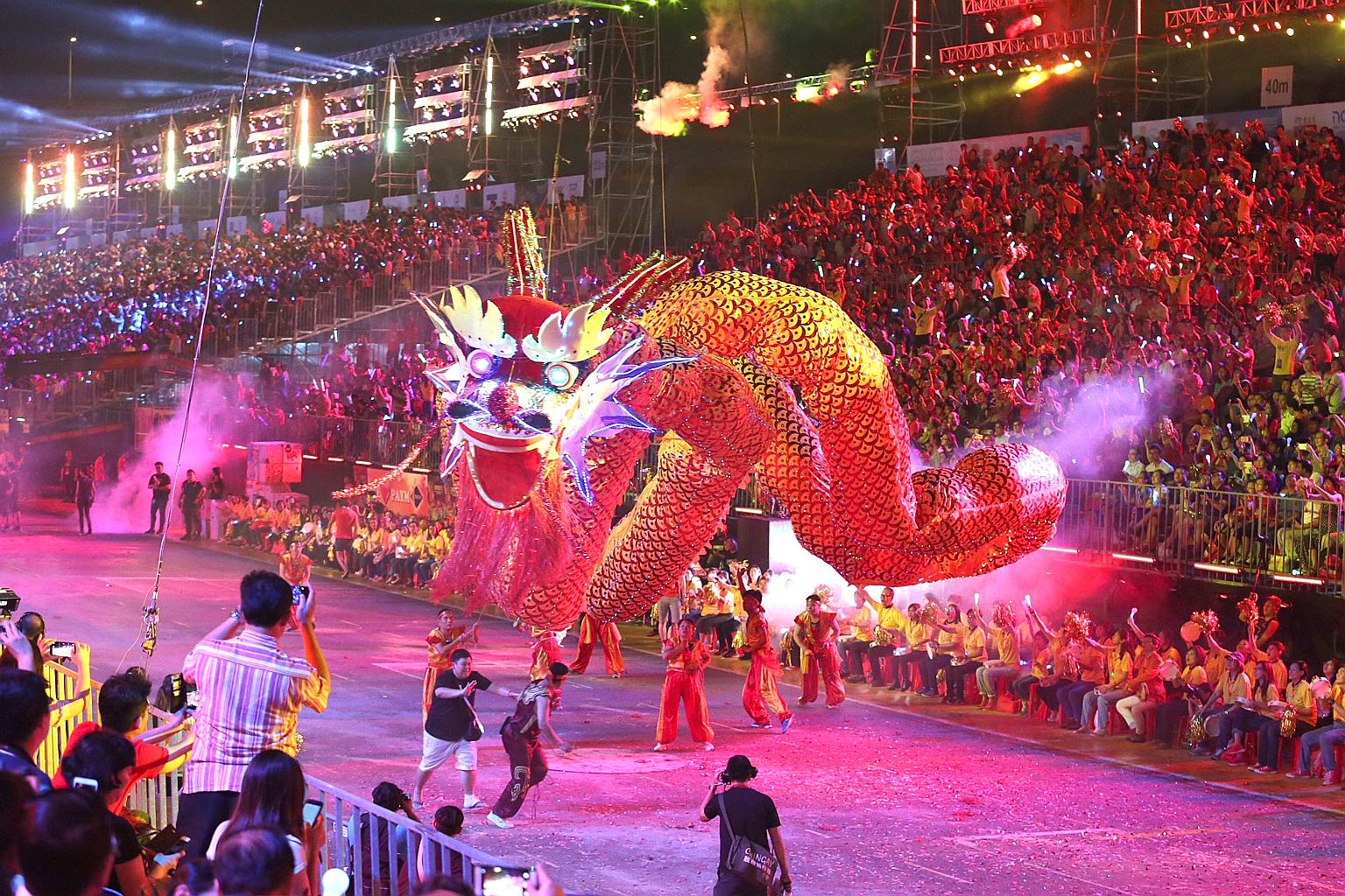A 66m-long helium-filled flying LED dragon, held by performers from China's Shaanxi province, made its world debut at the Chingay parade in February 2016.
