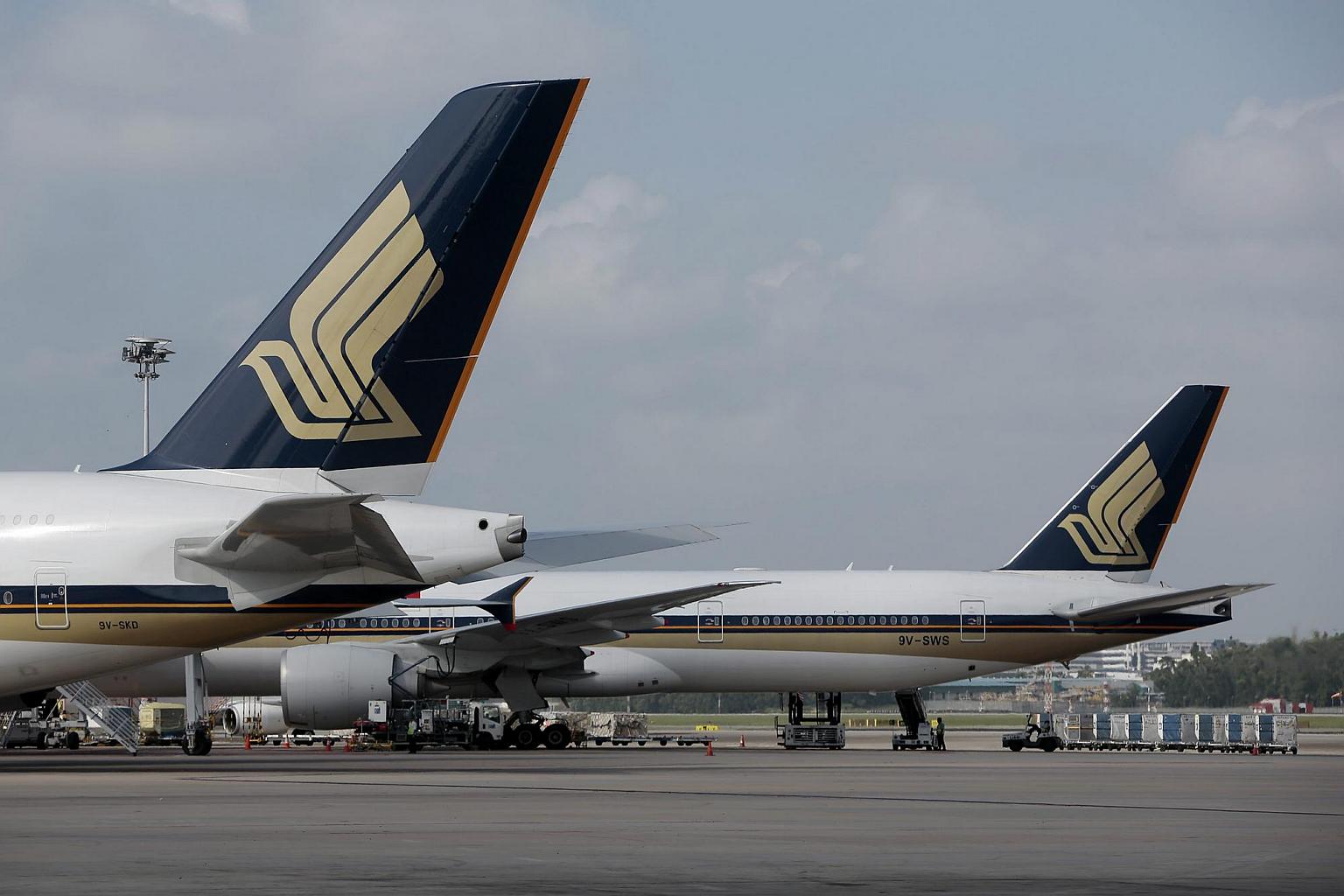 Two Singapore Airlines aircraft parked at the terminal in Changi Airport.