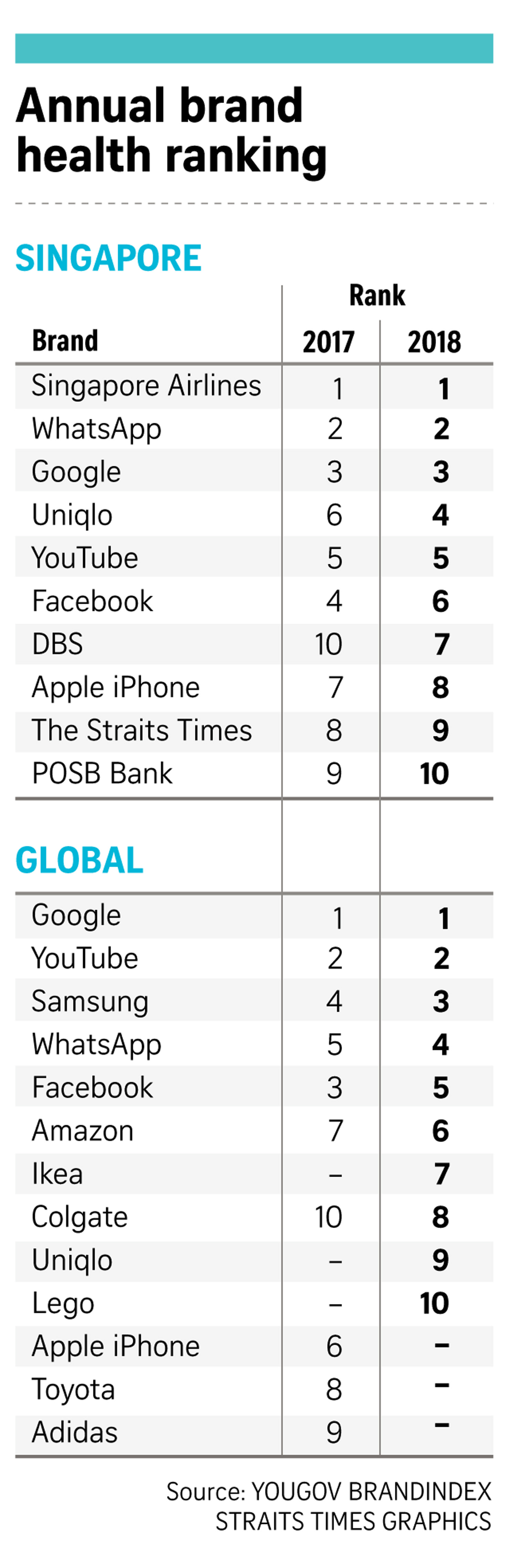 The Straits Times, DBS and POSB banks also among positively perceived brands