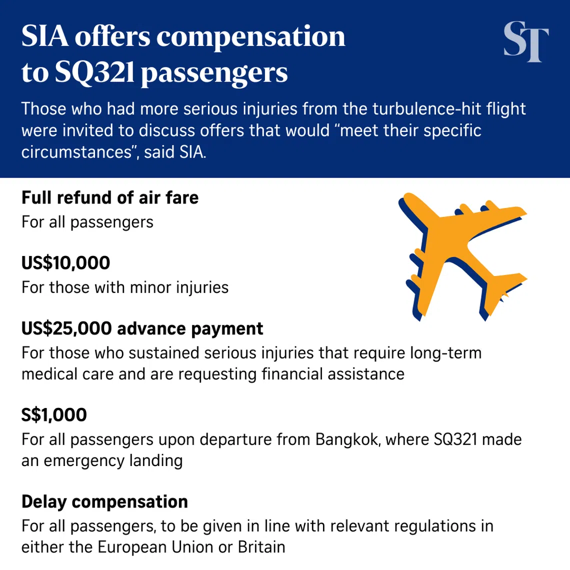 “We recognise that passengers with more serious injuries may require further support tailored to their individual circumstances. SIA has invited these passengers to discuss the compensation offer when (they) are well enough and ready to do so,” said a spokeswoman, adding that details of the compensation offers will be discussed directly with the affected passengers.
