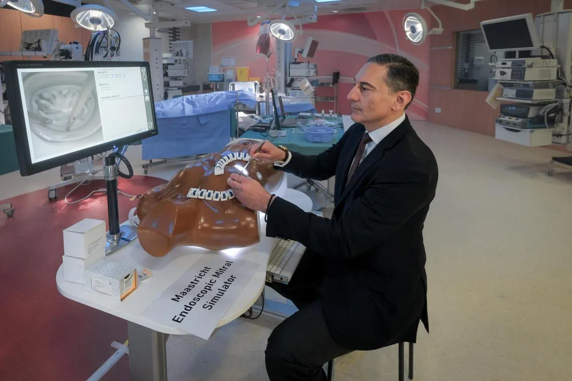 Professor Theodoros Kofidis, head of the department of cardiac, thoracic and vascular surgery at NUHCS, demonstrating the use of the Maastricht Endoscopic Mitral Simulator at the new Cardiac, Thoracic and Vascular Surgery Simulation Centre on March 10, 2023.