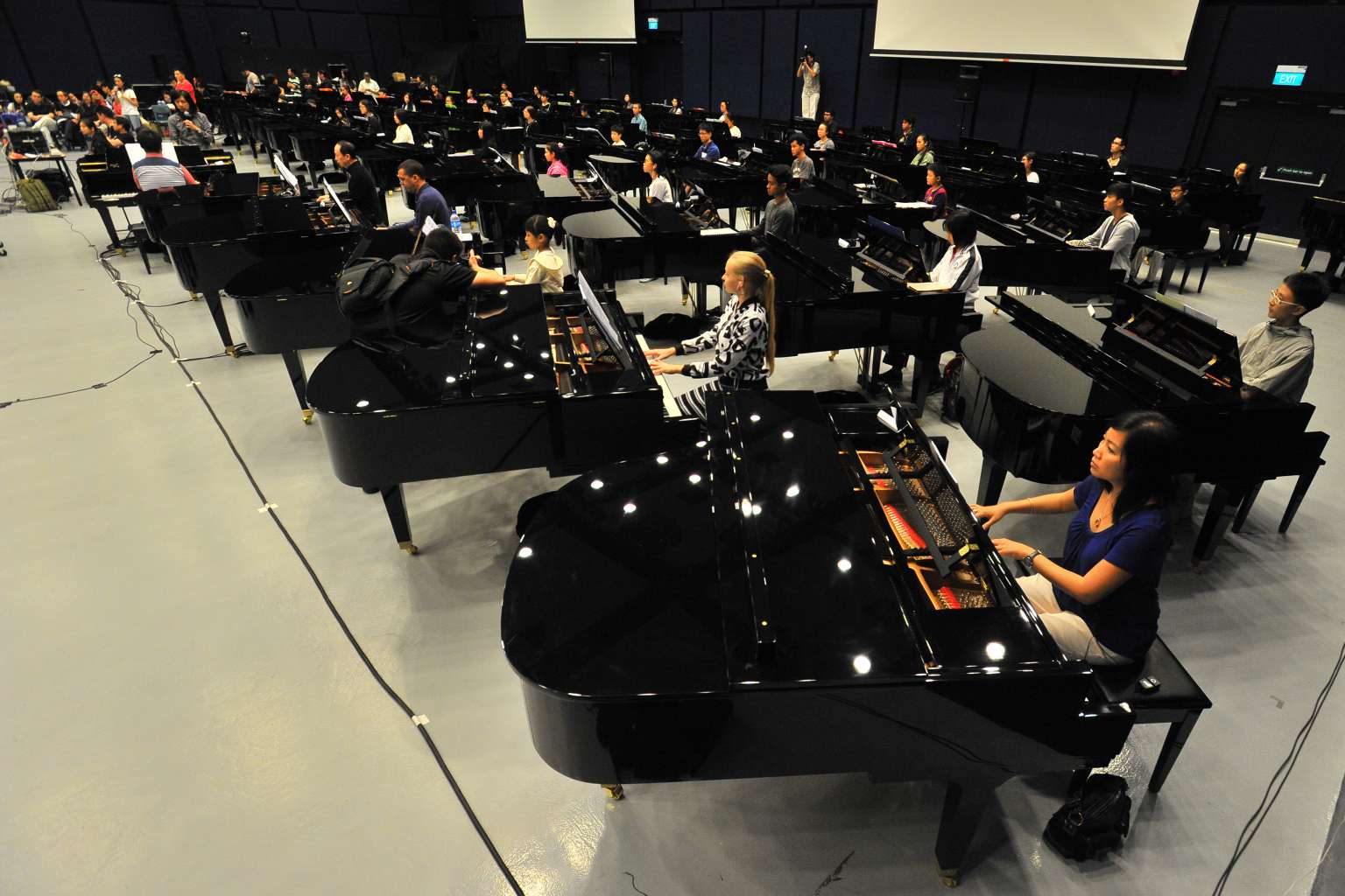 More than 90 musicians from the Metropolitan Festival Orchestra and the Sing50 orchestra mentees, alongside 50 pianists and Sing50 band rehearsing for Sing50 concert on 26 July 2015. PHOTO: LIM YAOHUI