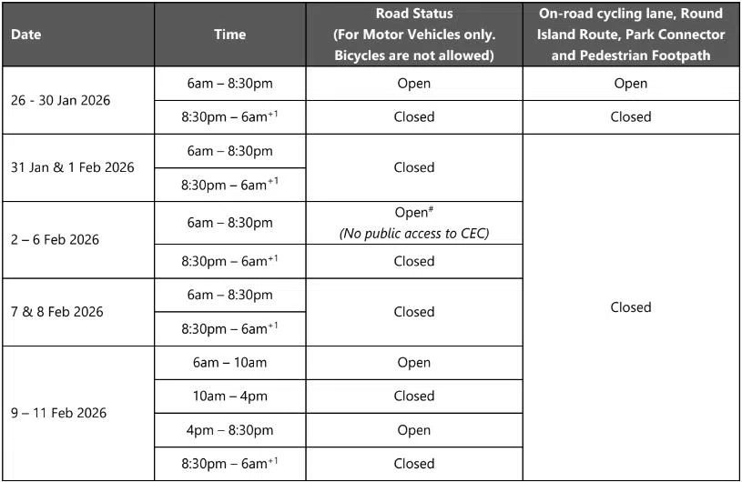From Changi Coast Road: Jan 31 to Feb 1, Feb 9 to 11