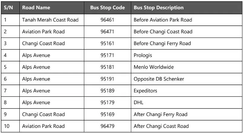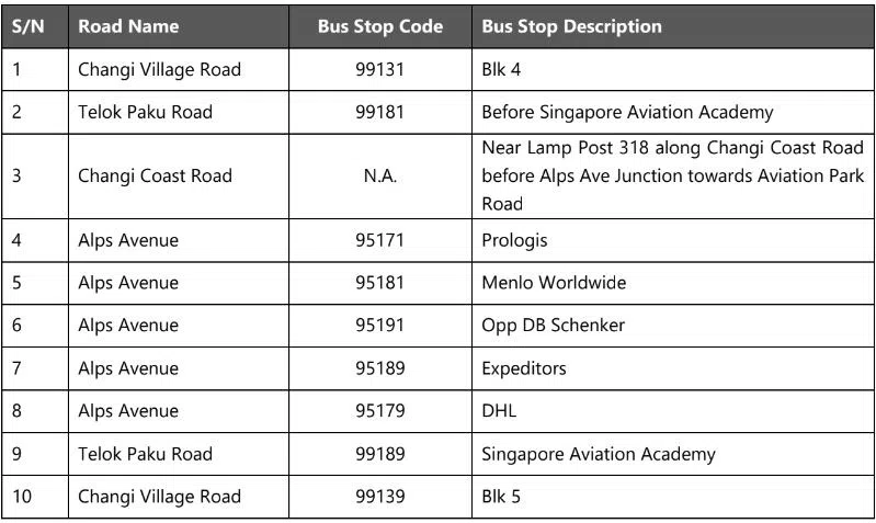 It will skip some stops in Alps Avenue, Aviation Park Road, Changi Coast Road and Tanah Merah Coast Road. However, a free shuttle service will operate between the Airport Logistics Park of Singapore and Changi Village every 10 to 15 minutes.