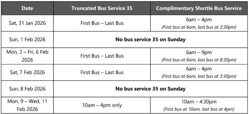 With the road closures and diversions, bus service 35 will operate a truncated loop between Bedok Interchange and Tanah Merah Coast Road, looping back after the bus stop opposite Changi Naval Base.