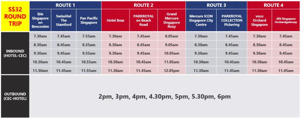 Members of the public travelling to Changi Exhibition Centre can board the air show shuttle service from Singapore Expo Hall 5 – the cost is $18 per person. However, those who have Weekend@Airshow tickets do not need to book shuttle tickets, as the admission tickets include complimentary shuttle rides to and from the air show site.