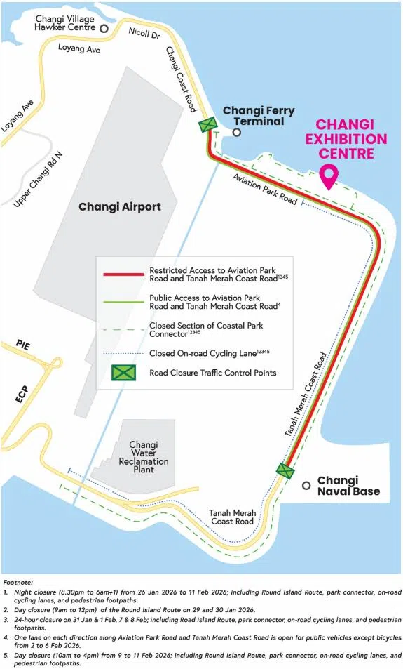 Only vehicles with valid Singapore Airshow labels, taxis and private hire vehicles will be allowed to enter Changi Exhibition Centre. The roads and their access periods are as follows: