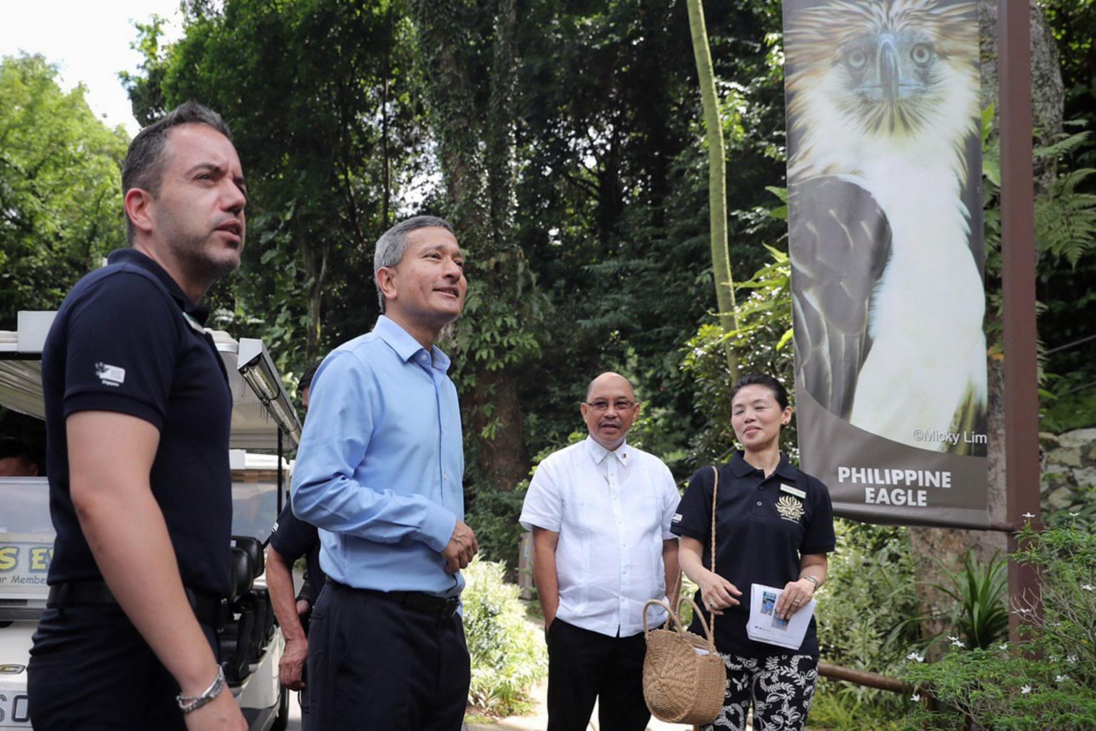 (From left) Wildlife Reserves Singapore Director of Zoology Dr Luis Carlos Neves, Foreign Minister Vivian Balakrishnan, and Philippine Environment and Natural Resources Department Assistant Secretary Ricardo L. Calderon viewing the Philippine eagles Geothermica and Sambisig at the Jurong Bird Park on Nov 27, 2019.