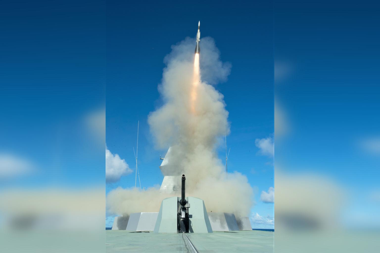 SINGAPORE - Off the coast of Guam in the western Pacific Ocean, Singapore frigate RSS Formidable fired a surface-to-air missile to intercept a high-speed aerial target flying at a distance that was hard to observe on radar