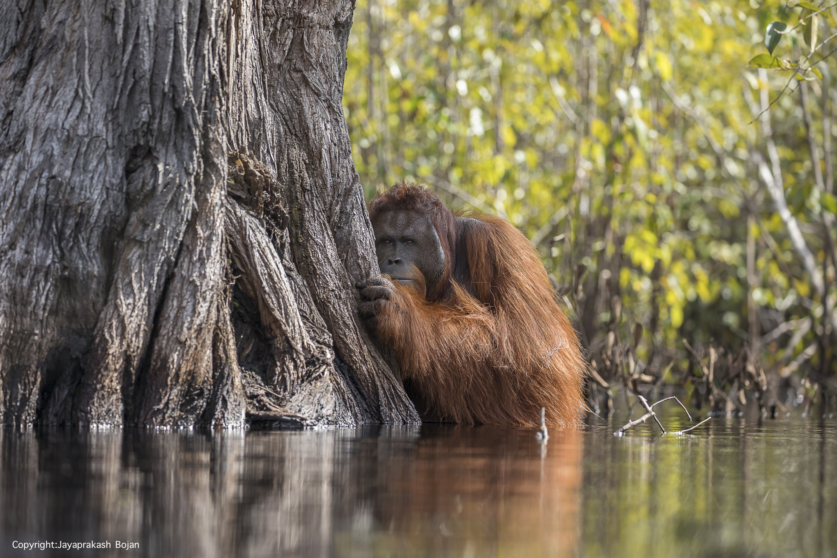 The stunning shot, titled Face To Face In A River In Borneo, shows the critically endangered ape peering out from behind a tree in a river in Tanjung Puting National Park in Central Kalimantan, Indonesia.