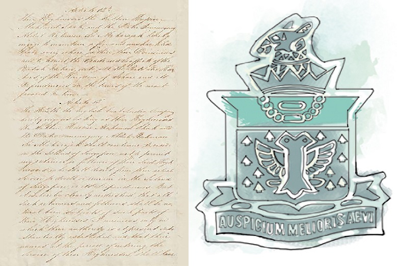 The Treaty of Friendship and Alliance from the 1820s (left) and the Raffles Institution school badge from the 1830s.