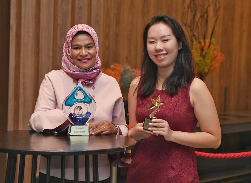 Madam Rashidah Abdul Rasip (left) received the Ruth Wong Award, while the late Ms Angela Koh Chay Yong received a gold award, which was collected by her niece Go Li Jia (right).