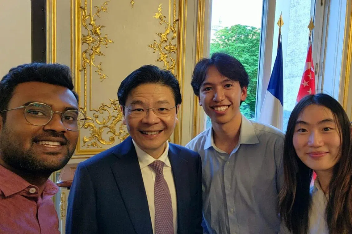 Deputy Prime Minister Lawrence Wong with (from left) Mr Vignesh Kumaravel, Mr Leroy Koh and Ms Chien Shi Yun at a reception for overseas Singaporeans in Paris at Hotel Le Marois on April 11.