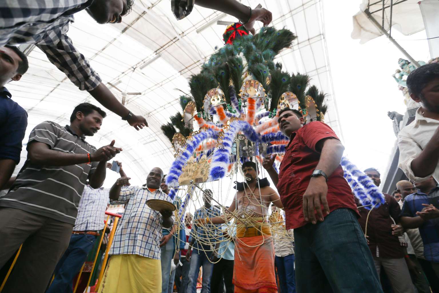 A Hindu devotee carrying a kavadi at Sri Srinivasa Perumal Temple during Thaipusam on Feb 3, 2015.