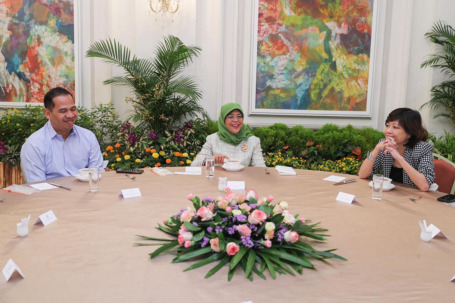 President Halimah Yacob (centre) meeting NTUC vice-president Abdul Samad Abdul Wahab (left) and NTUC deputy secretary-general Cham Hui Fong.