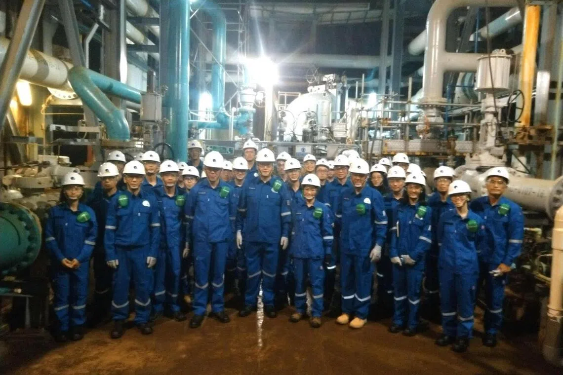 Coordinating Minister for Public Services and Defence Minister Chan Chun Sing (front row, third from left), and Minister-in-charge of Energy and Science & Technology and Manpower Minister Tan See Leng (front row, fourth from left) visiting the Jurong Rock Caverns facility.