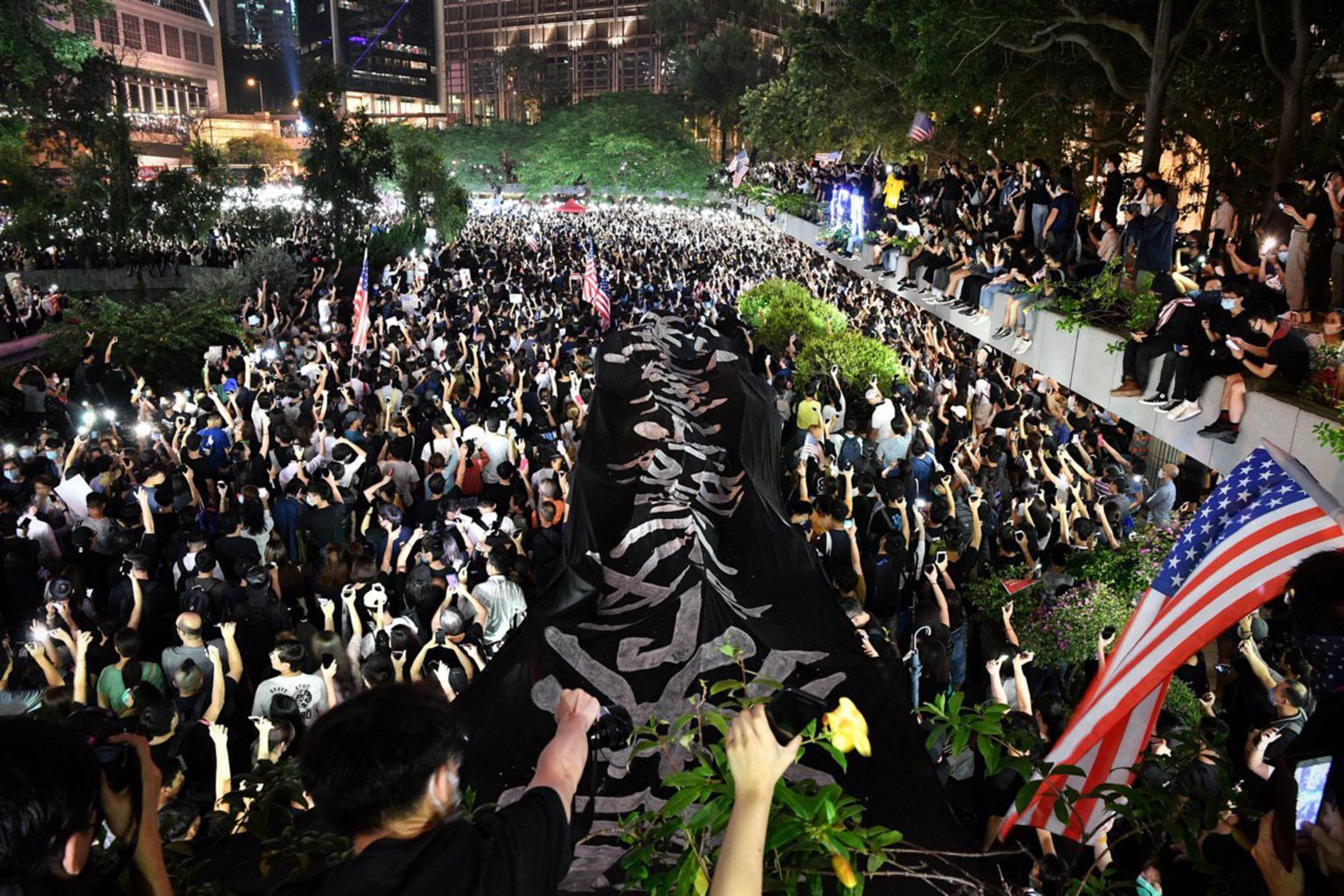 In this photo taken on Oct 14, 2019, protesters bring out a giant banner at Chater Garden, Hong Kong.