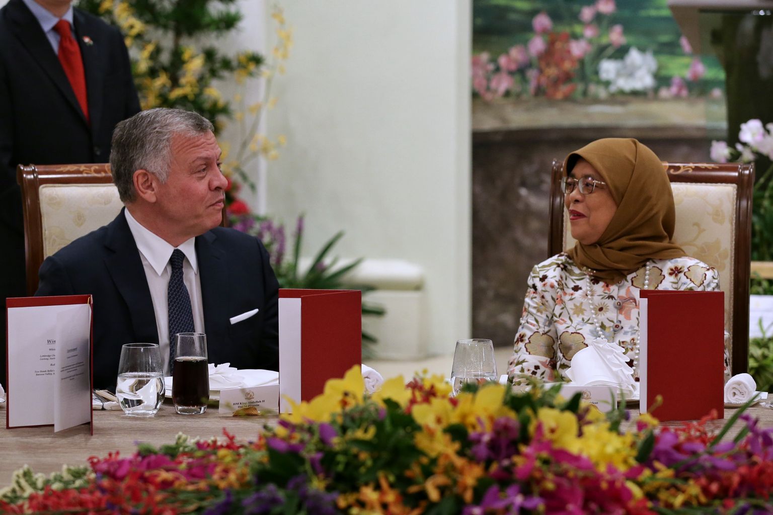 President Halimah Yacob speaking with Jordan’s King Abdullah II during a state banquet at the Istana.