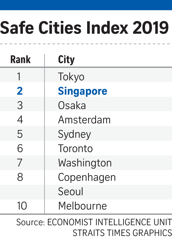 Singapore has retained its position as the world's second safest city, after Tokyo, in a global index that looks at indicators including the ability of communities to bounce back after a disaster or cyber attack.